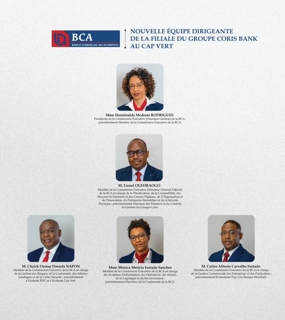 La nouvelle équipe comprend également Cheick Oumar Daouda Napon, chargé des risques, de la conformité, des affaires juridiques et de la cybersécurité, Mónica Merícia Furtado Sanches, responsable des systèmes d’information, des opérations et de la logistique, ainsi que Carlos Alberto Carvalho Furtado, chargé de la gestion commerciale des entreprises et des particuliers.